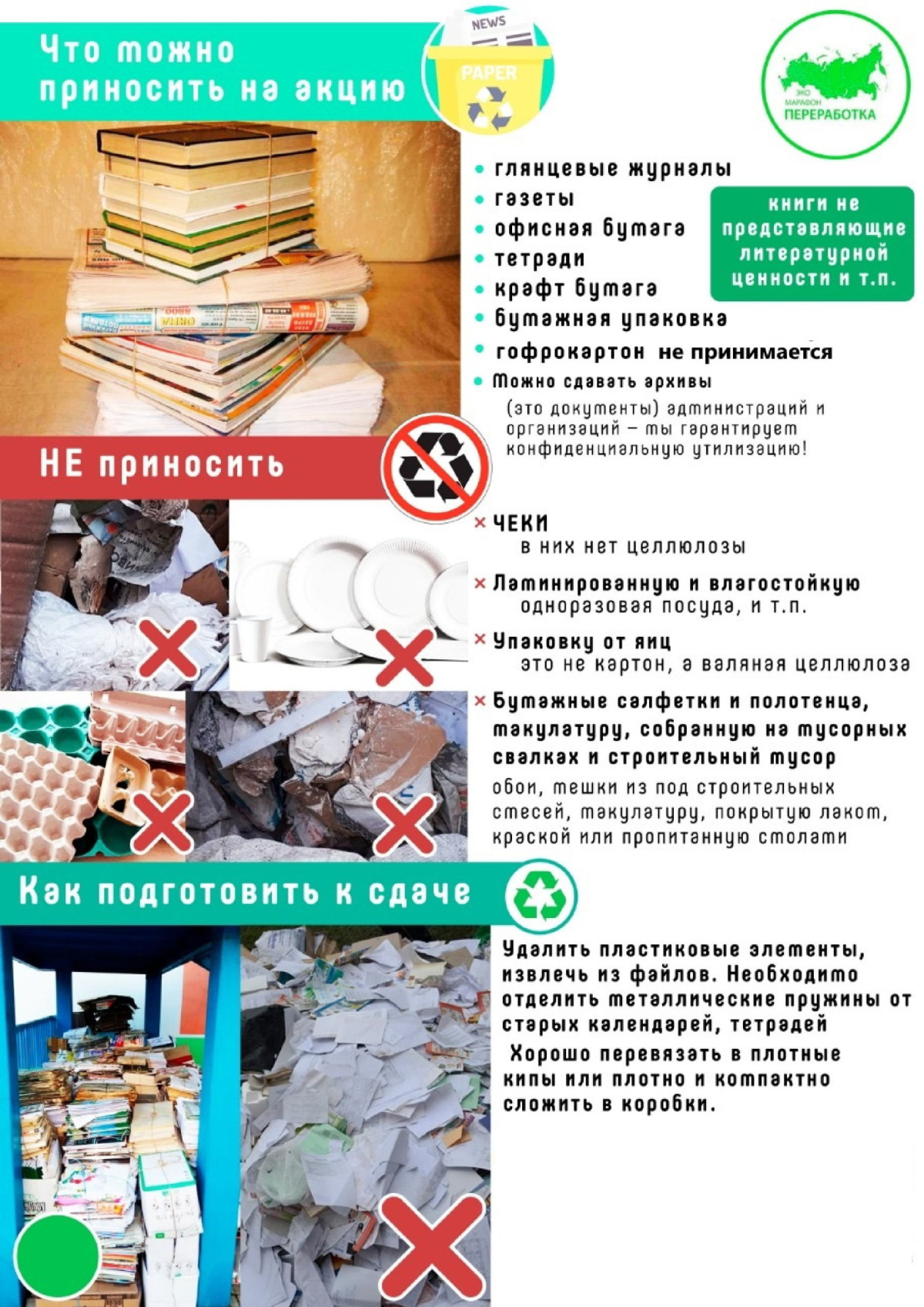 Вторичной переработке подлежат: глянцевые журналы, газеты, офисная бумага, тетради, крафт бумага, бумажная упаковка, книги, не представляющие литературной ценности и т.п.