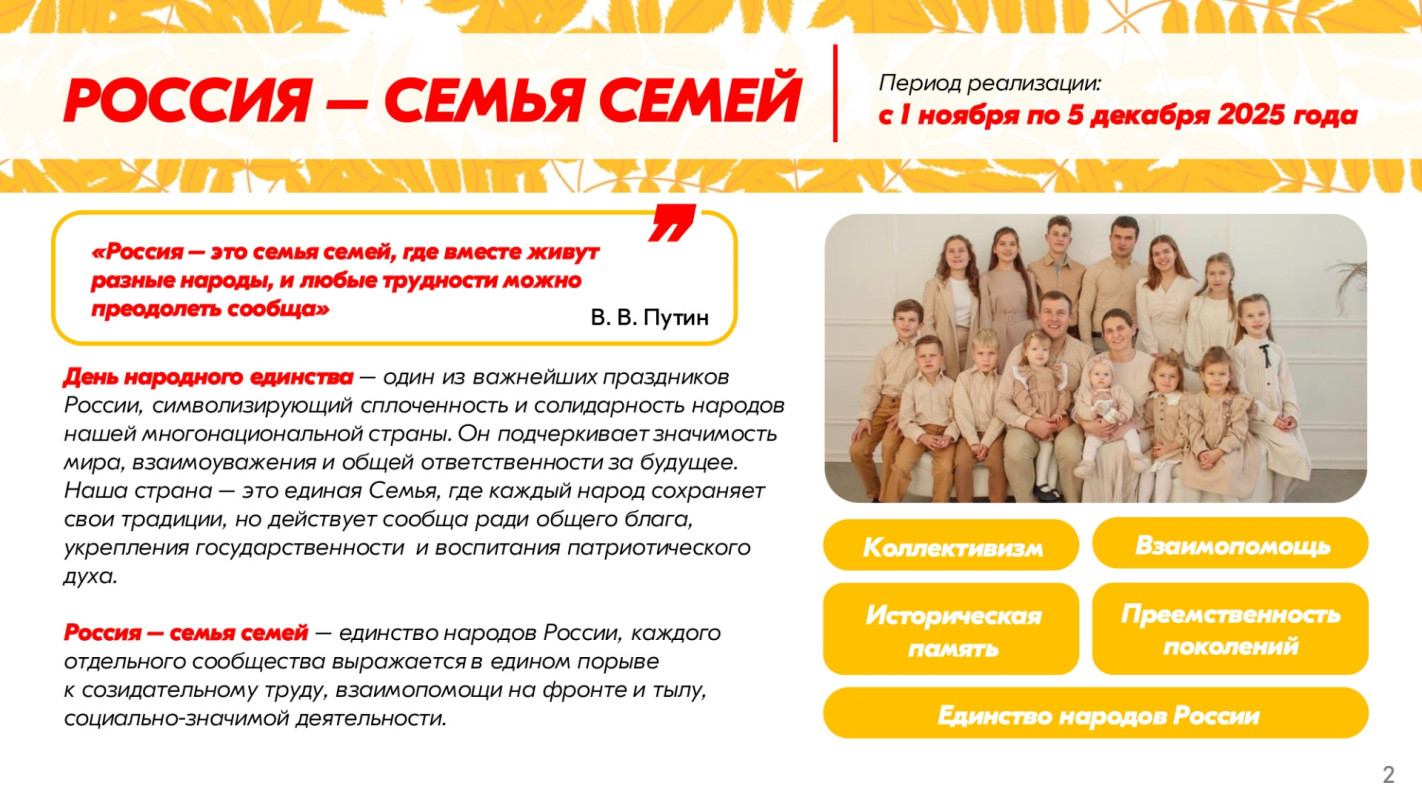 День народного единства — это символ сплочённости, взаимопомощи и гордости за нашу многонациональную страну! С 1 ноября по 5 декабря проходит акция «Россия – семья семей», посвящённая единству народов России и преемственности поколений.
