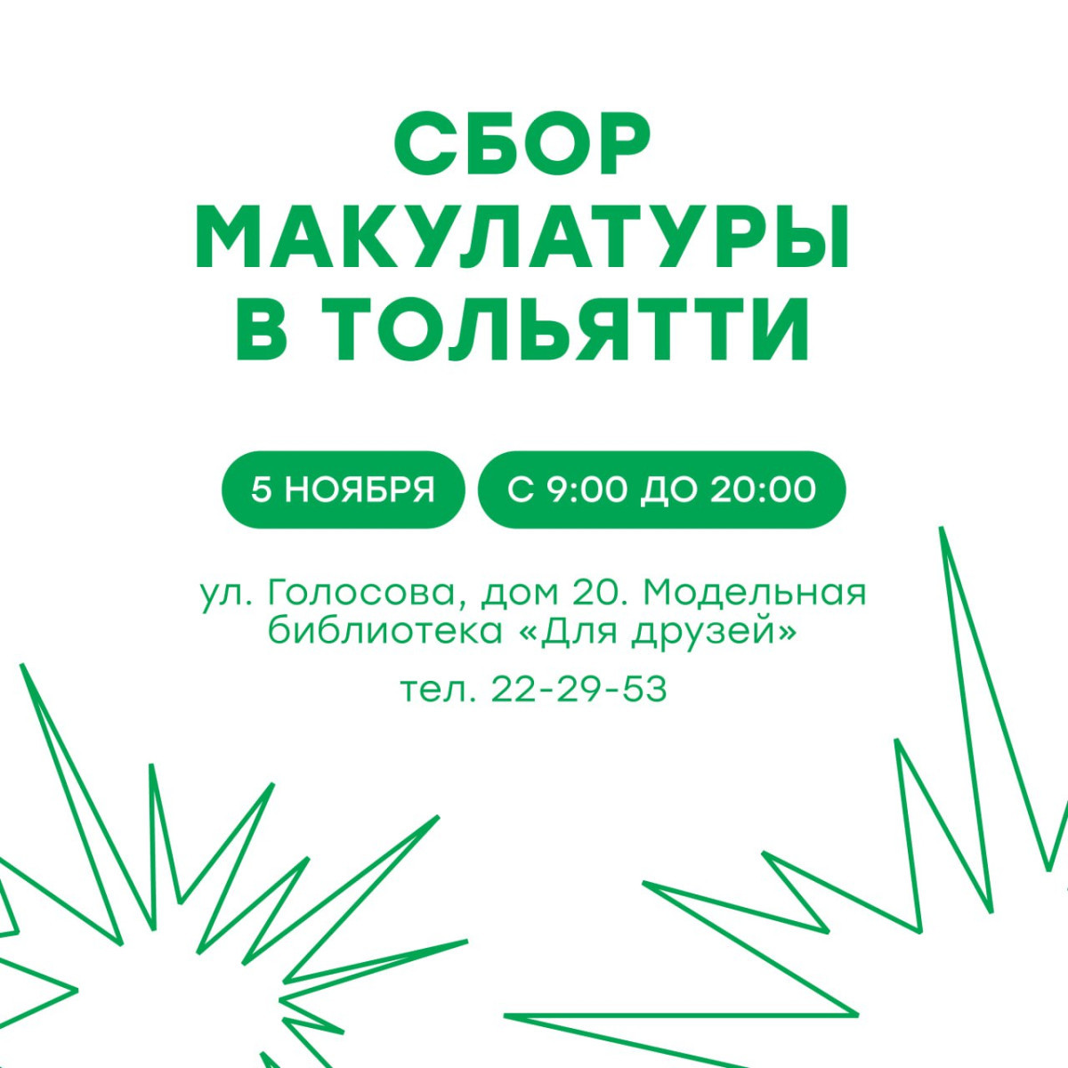Жители Тольятти смогут сдать вторсырьё 5 ноября с 9:00 до 20:00 в модельной библиотеке «Для друзей» (ул. Голосова, 20) — пункт сбора организован общественным экологическим движением «Широко шагая»