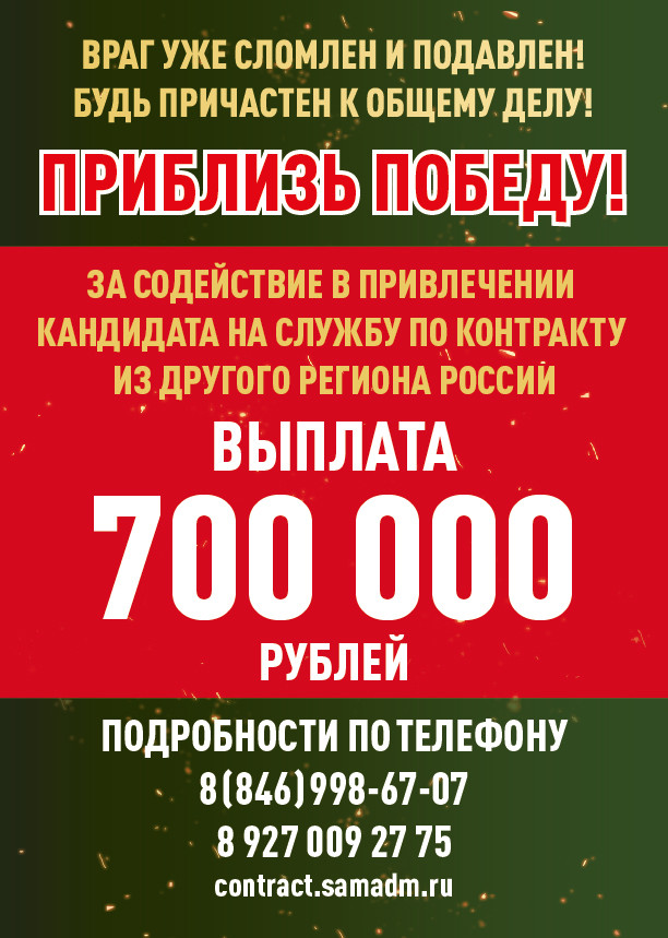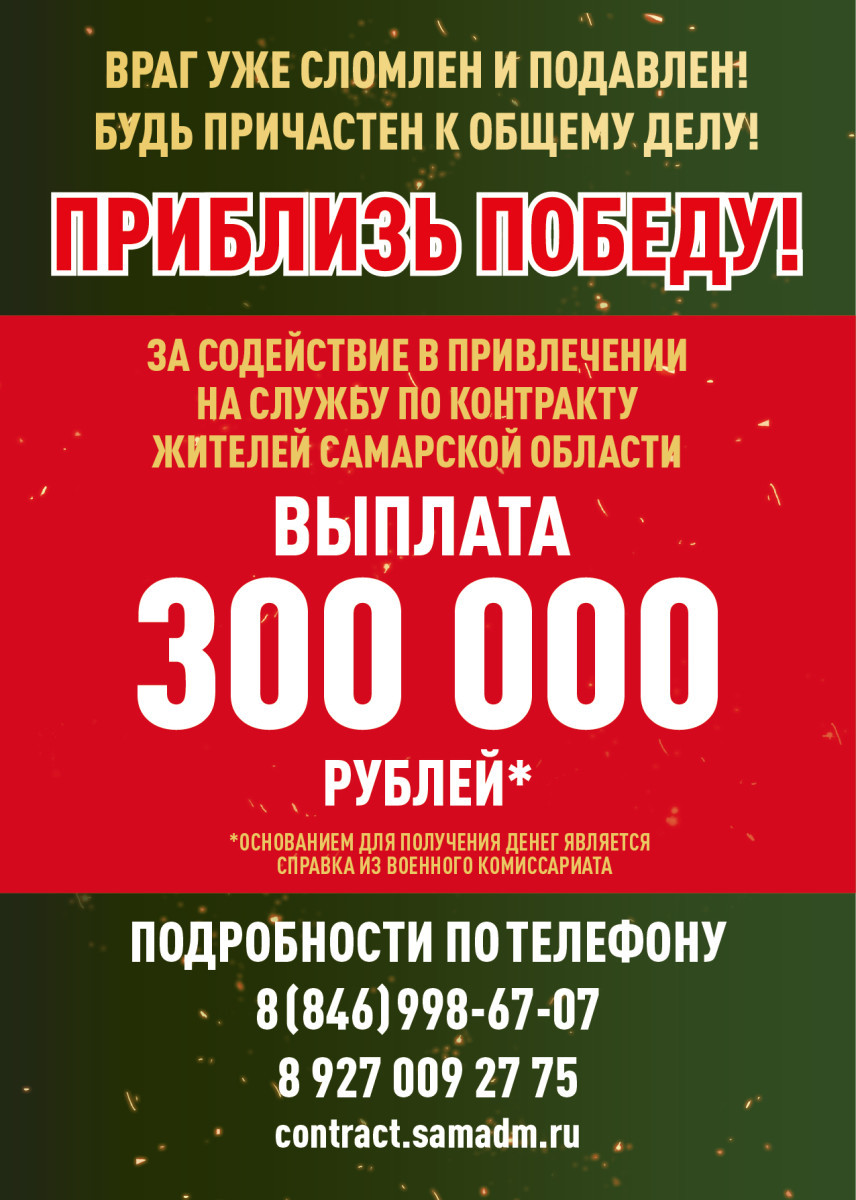 В Самарской области определена выплата для жителей, оказавших содействие в проведении агитации и помощь в прибытии кандидата в военный комиссариат или пункт отбора для заключения воинского контракта.